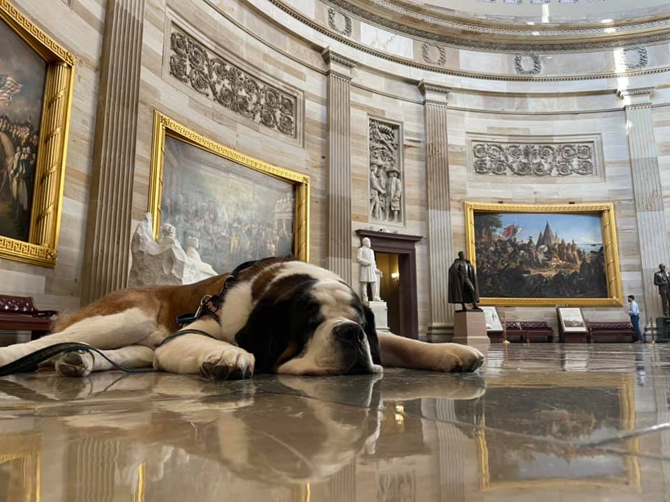 (Greenfield, MA) Greenfield Deputy Chief William Gordon along with local celebrity good dog Officer Clarence are returning home today from the Capitol. Earlier in the week, Gordon posted on his Facebook page that Clarence was trending in the top 13 on Twitter. Officer Clarence even had his own trading cards made by Custom Trading Cards, a custom card company that specializes in promotional, marketing, and retail products. Officer Clarence also had his own meet and greet with members of Congress and White House media. National media, including ABC news, continued to report on his presence in the Capitol through April 15. Officer Clarence was also featured on the twitter account The Oval Pawffice.