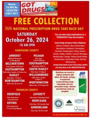 FRANKLIN COUNTY, MA (FRANKLIN COUNTY NOW) — The 26th National Prescription Drug Take Back Day will be held this Saturday, October 26th from 10 a.m. to 2 p.m. across Franklin and Hampshire counties.