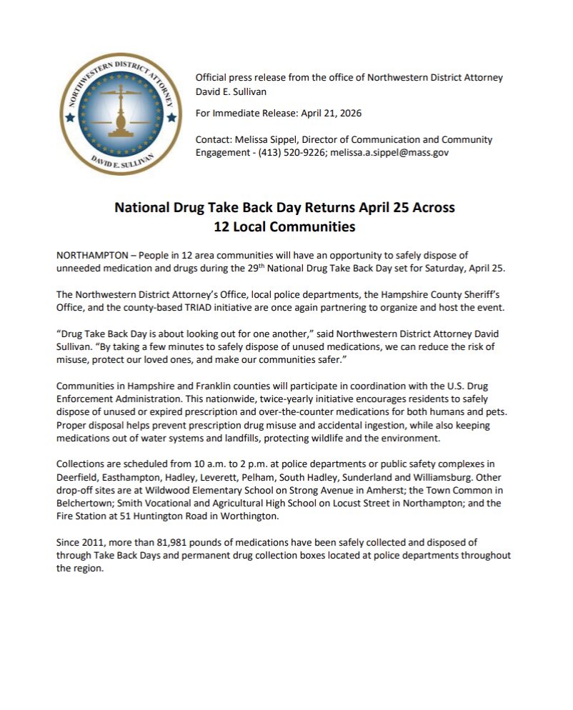 NORTHAMPTON, MA (FRANKLIN COUNTY NOW) — The 29th National Drug Take Back Day is set for Saturday, April 25th. The Northwestern District Attorney’s Office, local police departments, the Hampshire County Sheriff’s Office, and the county-based TRIAD initiative are once again partnering to organize and host the event serving twelve area communities. Collections are scheduled from 10 a.m. to 2 p.m. at police departments or public safety complexes.