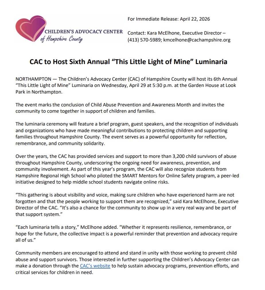 NORTHAMPTON, MA (FRANKLIN COUNTY NOW) — Over the years, the Children’s Advocacy Center has provided services and support to more than 3,200 child survivors of abuse. To mark the conclusion of Child Abuse Prevention and Awareness Month, the CAC will host its 6th Annual “This Little Light of Mine” Luminaria on Wednesday, April 29 at 5:30 p.m. at the Garden House at Look Park in Northampton.
