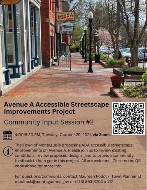MONTAGUE, MA (FRANKLIN COUNTY NOW) — A second community input session is coming for Montague’s Avenue A ADA Accessible Streetscape Improvements Project. Information from the first community input session, including compiled comments, presentation slides, proposed designs, and the meeting recording can be found here.