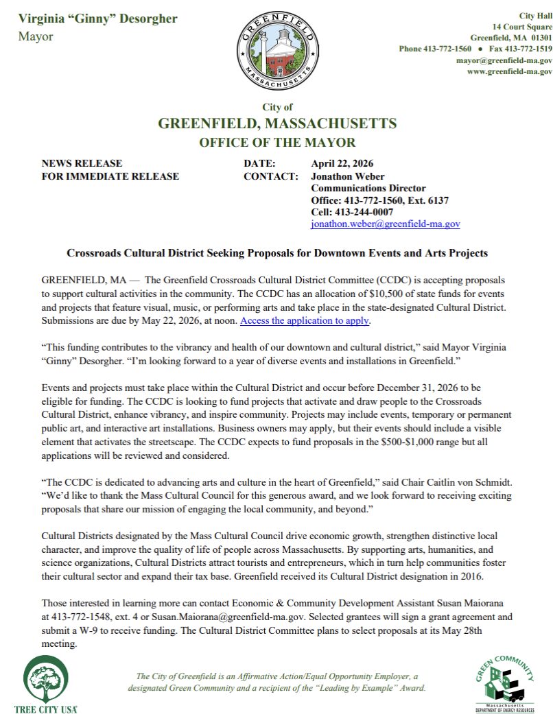 GREENFIELD, MA (FRANKLIN COUNTY NOW) — The Greenfield Crossroads Cultural District Committee (CCDC) is accepting proposals to support cultural activities in the community. The CCDC has an allocation of $10,500 of state funds for events and projects that feature visual, music, or performing arts and take place in the state-designated Cultural District. Submissions are due by May 22, 2026, at noon.