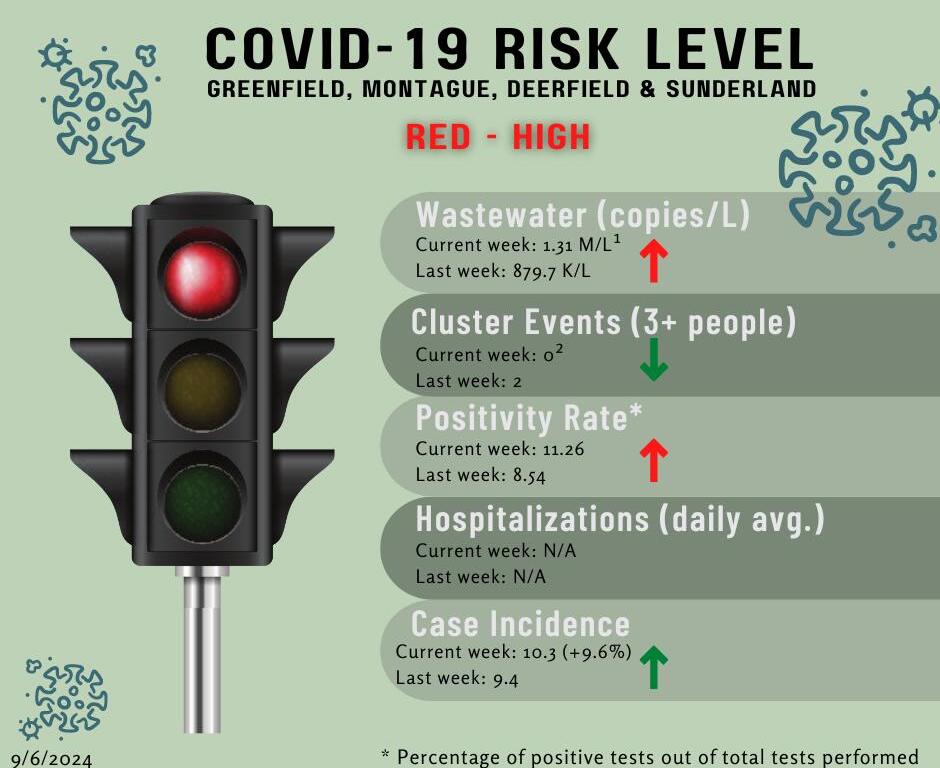 GREENFIELD, MA (FRANKLIN COUNTY NOW) — COVID-19 risk levels have risen to “high” in Greenfield, Montague, Deerfield, and Sunderland for the first time since the winter months. The risk level is supported by a jump in COVID-10 presence through wastewater data and the 11.26 positivity rate in testing.