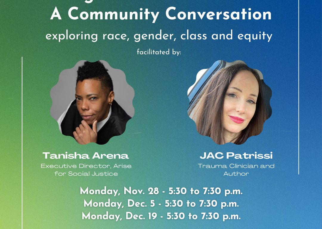 (Greenfield, MA) Monday, November 28th the first of three community conversations will take place in Greenfield on race, gender, class, equity, and other topics. These conversations will be hosted by outside facilitators Tanisha Arena, the executive director of Arise for Social Justice, and JAC Patrisssi, international trauma clinician and author.