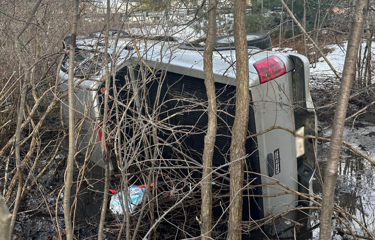 (South Deerfield, MA) Just before 4 p.m. Tuesday, a pick up truck rolled into a ditch near the Red Roof Inn on Greenfield Road in South Deerfield. The driver was uninjured and able to remove themselves from the vehicle. South Deerfield Fire, Deerfield Police, and South County EMS all responded to the scene.