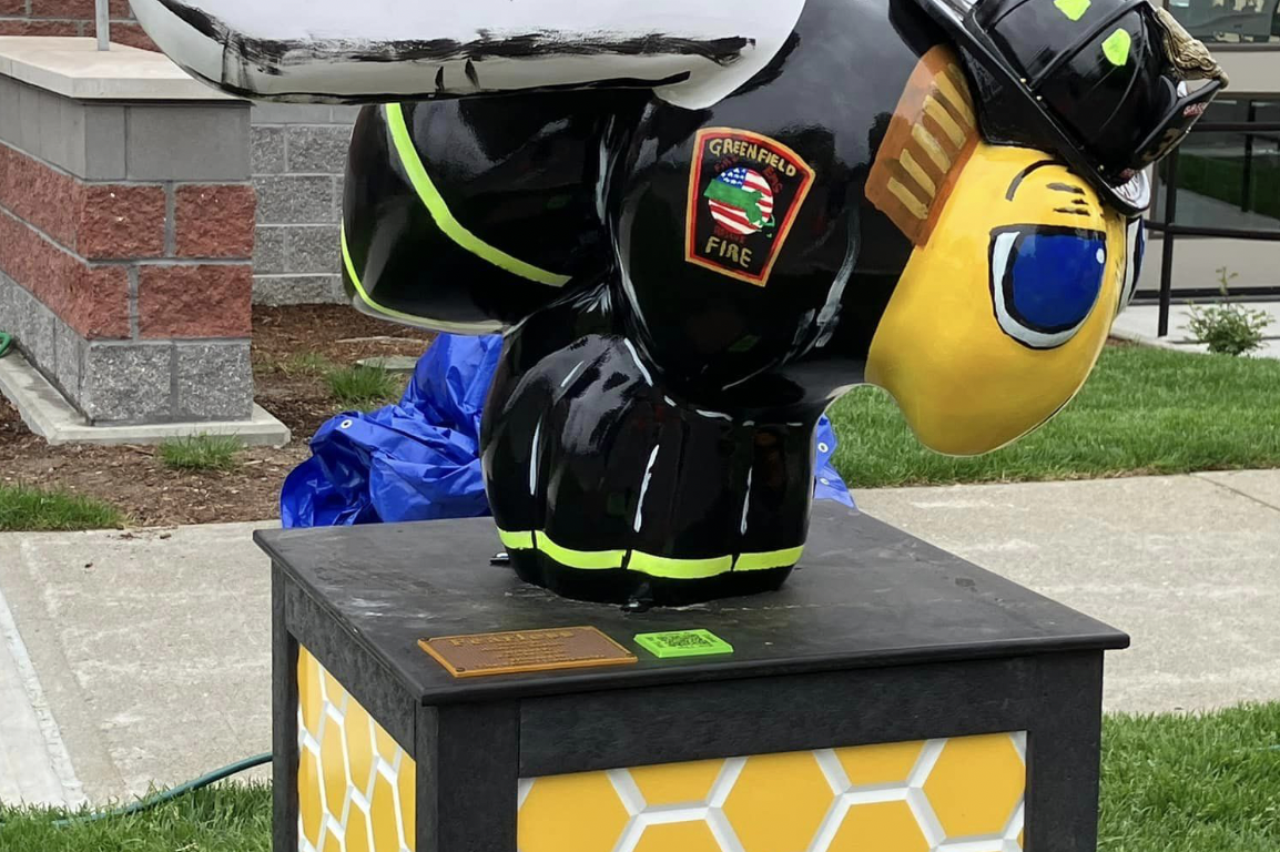 GREENFIELD, MA (FRANKLIN COUNTY NOW) —  At the Greenfield Bee Fest, held over the weekend, a new bee sculpture was unveiled at the Fire Station. The bee is named “Fearless” and is dressed in firefighter gear with an oxygen tank and firefighter hat. This year’s event brought in record numbers with over 1100 attendees and over 60 volunteers. Next year, the event will be celebrating fifteen years.