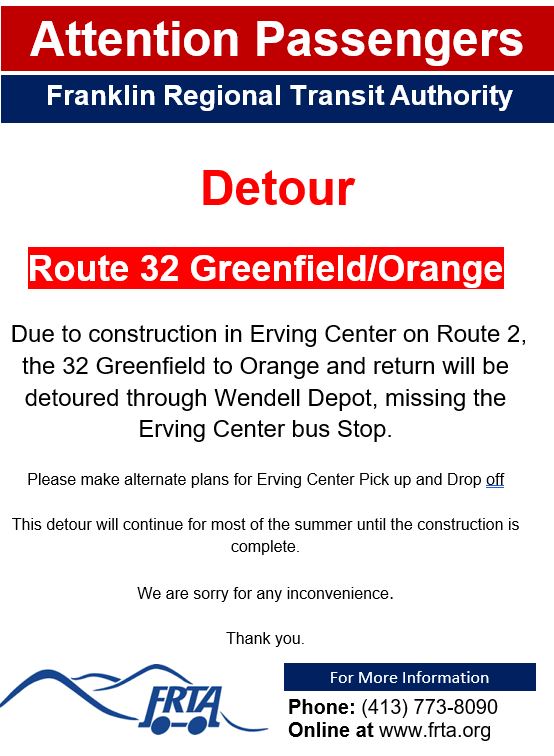 ERVING, MA (FRANKLIN COUNTY NOW) — The Franklin Regional Transit Authority announced a detour on the 32 Greenfield to Orange and return bus line due to the Route 2 construction project in Erving Center. While the construction is underway, the 32 bus will be detoured through Wendell Depot in both directions, missing the Erving Center stop. The detour is planned to be in place for most of this summer, until construction is complete.