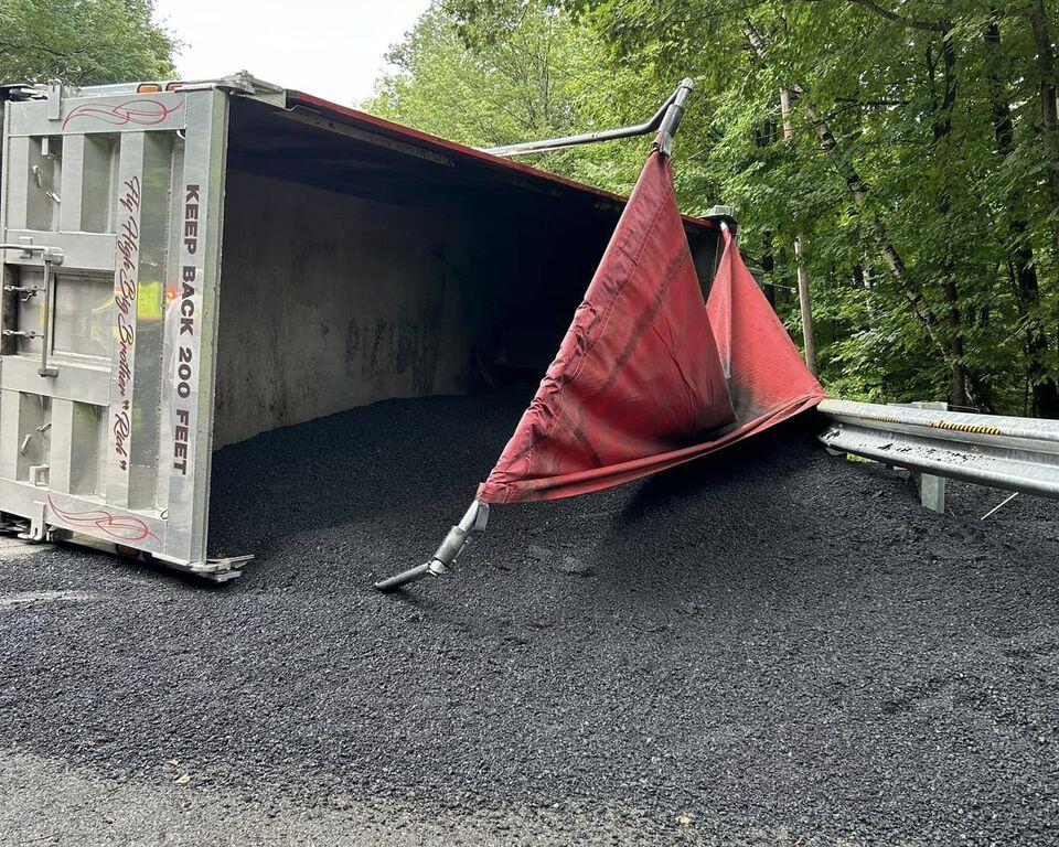 HAWLEY, MA (FRANKLIN COUNTY NOW) — A ten-wheeler dump truck rolled over at the hair pin turn on East Hawley Road in Hawley Wednesday. The dump truck had been fully loaded with asphalt and rolled over dumping its contenting over the roadway and into a stream. The Department of Environmental Protection was notified of the spill in the wetlands.
