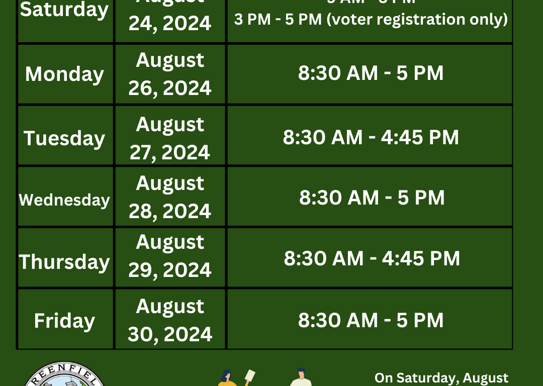 GREENFIELD – Ahead of the 2024 Massachusetts primary election on Tuesday, September 3, 2024, the City Clerk’s Office is announcing its early voting hours.