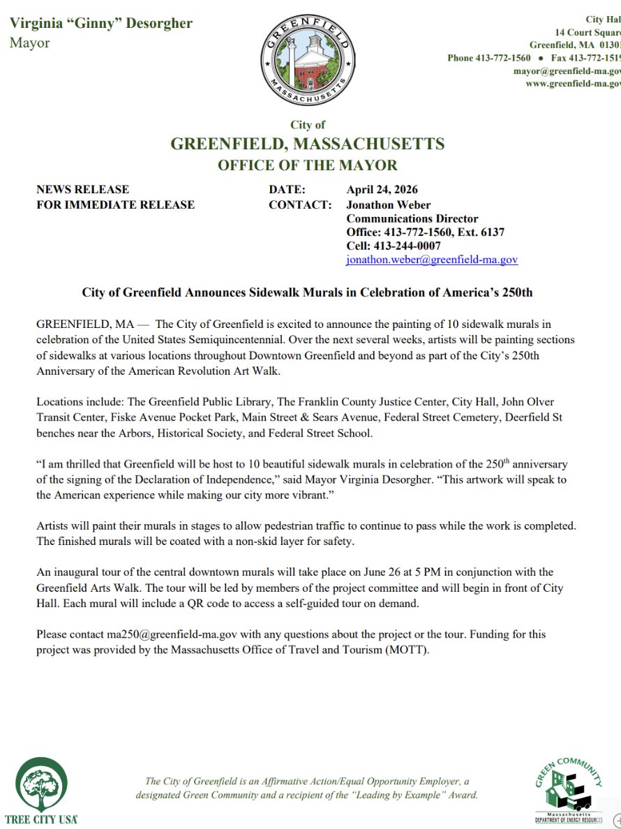 GREENFIELD, MA (FRANKLIN COUNTY NOW) — The City of Greenfield is having ten sidewalk murals painted by artists in celebration of the United States Semiquincentennial, the 250th anniversary of the signing of the Declaration of Independence. Artists will paint their murals in stages to allow pedestrian traffic to continue to pass while the work is complete and an inaugural tour of the central downtown murals will take place on June 26 at 5 PM in conjunction with the Greenfield Arts Walk.