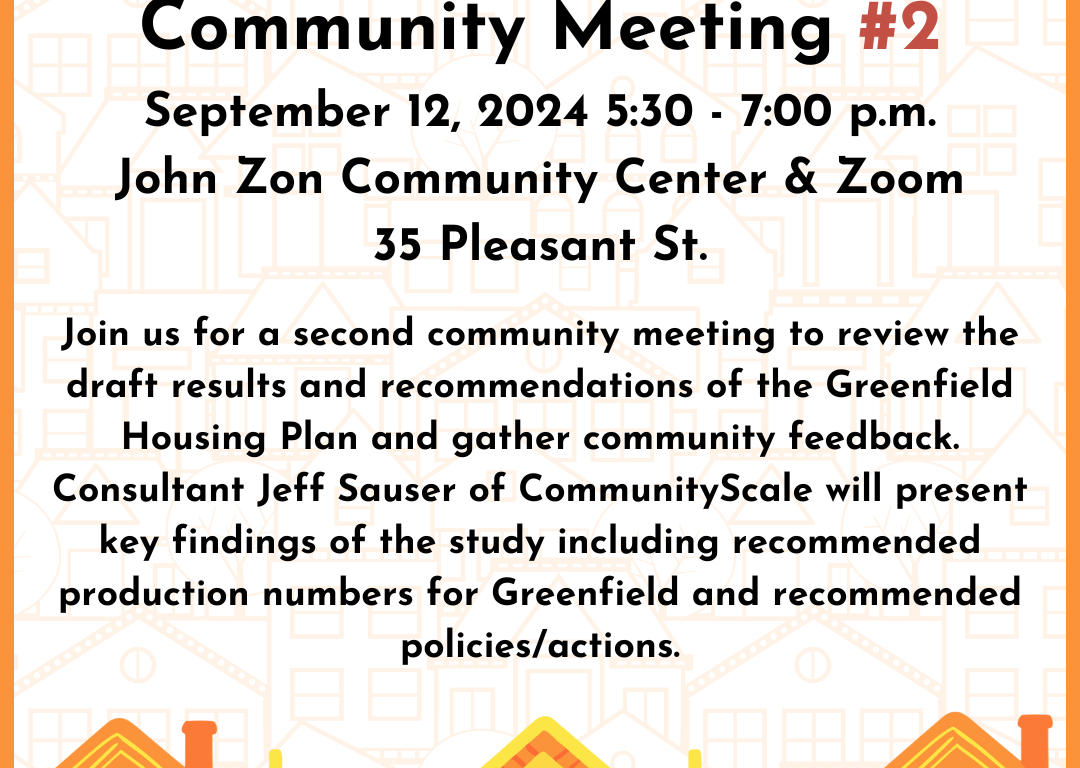 GREENFIELD – The Greenfield Community and Economic Development Department welcomes residents and community stakeholders on Thursday, September 12 for the second Housing Study Community Meeting. The gathering will take place at the John Zon Community Center and remotely via Zoom from 5:30 – 7:30 PM.
