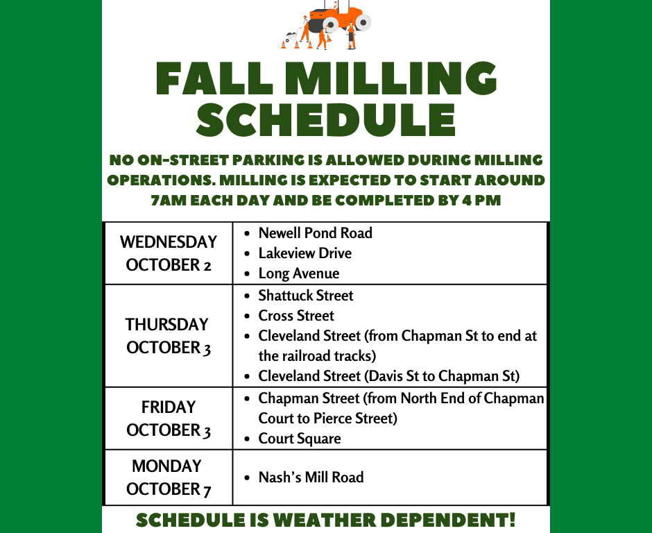GREENFIELD, MA (FRANKLIN COUNTY NOW) — The Greenfield DPW has released their fall paving schedule, which will begin on Wednesday, October 2nd with milling on Newell Pond Road, Lakeview Drive, and Long Avenue.