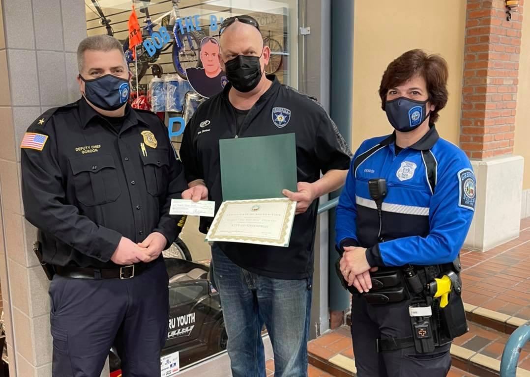 (Greenfield, MA) The Greenfield Police Department was part of the Pedal Thru Youth Foundation’s storefront opening in the Eastfield Mall yesterday. The Greenfield Police Association presented “Bicycle Bob” Charland for the Pedal Thru Youth foundation to further the supplies of bicycles and supplies to children in need, the unsheltered population, and individuals with food insecurity. Officers also presented a certificate of recognition to Charland on behalf of Mayor Wedegartner for the donations of backpacks, foot, treats, and coats to Greenfield’s vulnerable citizens.