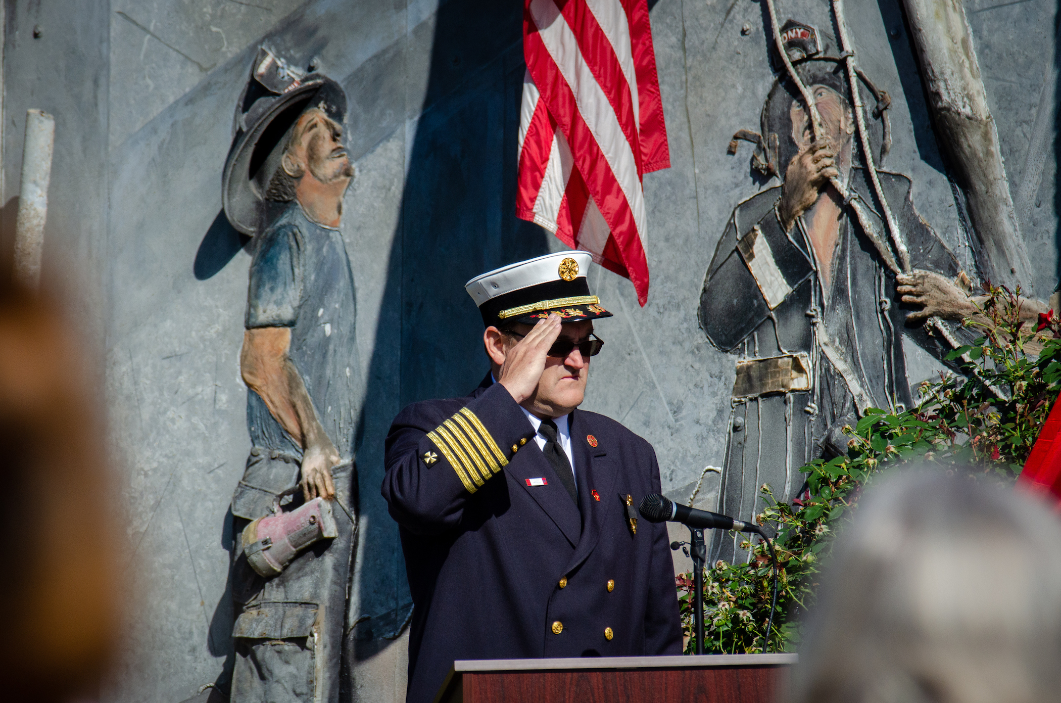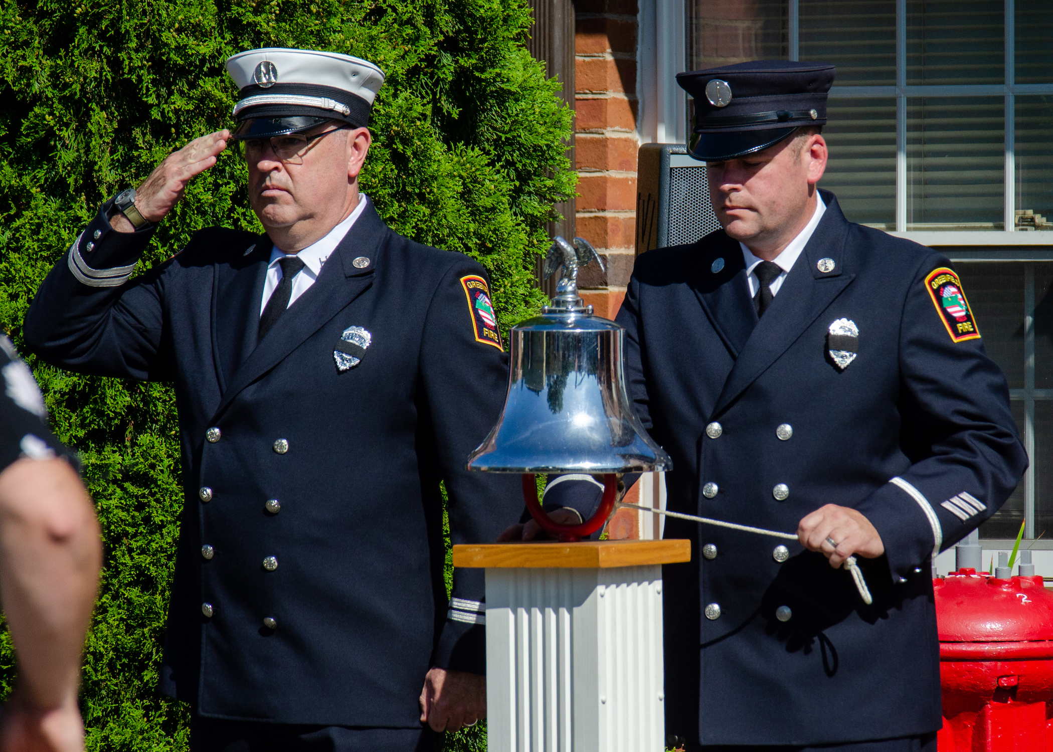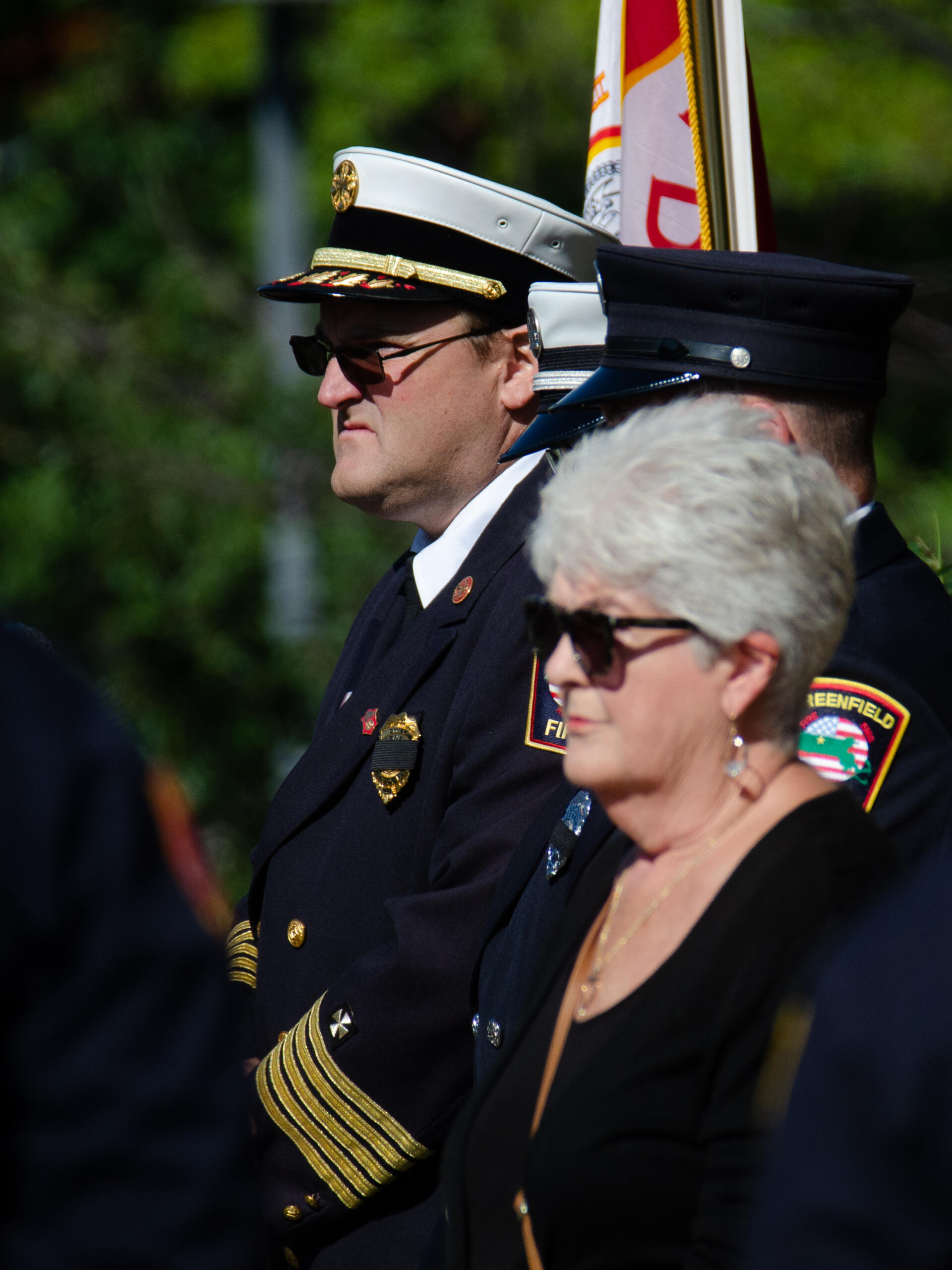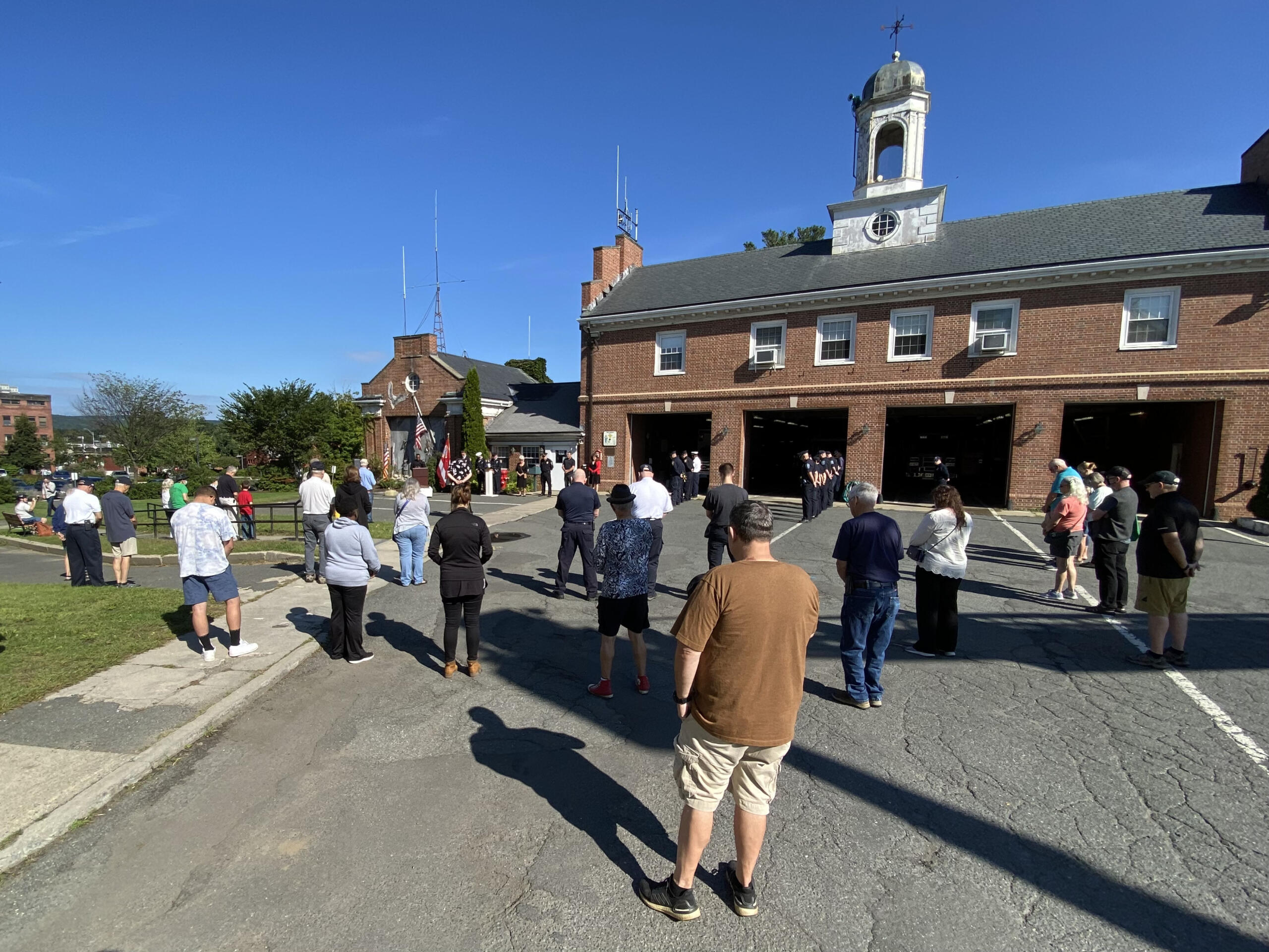 (Greenfield, MA) At 10am on September 11, 2021 members of the Greenfield community as well as Greenfield fire fighters and Greenfield police gathered to remember the events of September 11, 2001. The event included speakers from the Greenfield community as well as individuals who were working and living in New York City at the time of the attacks.