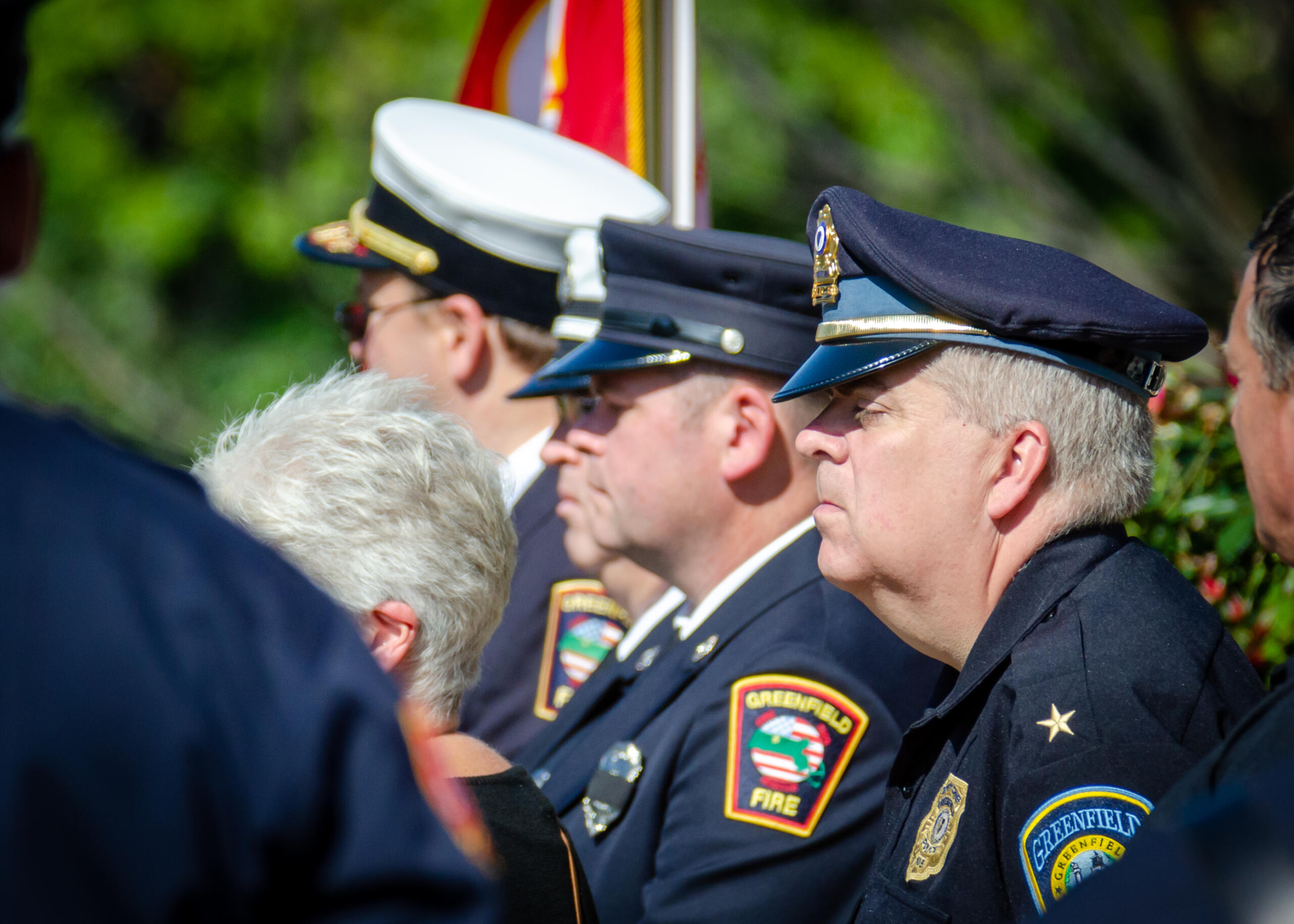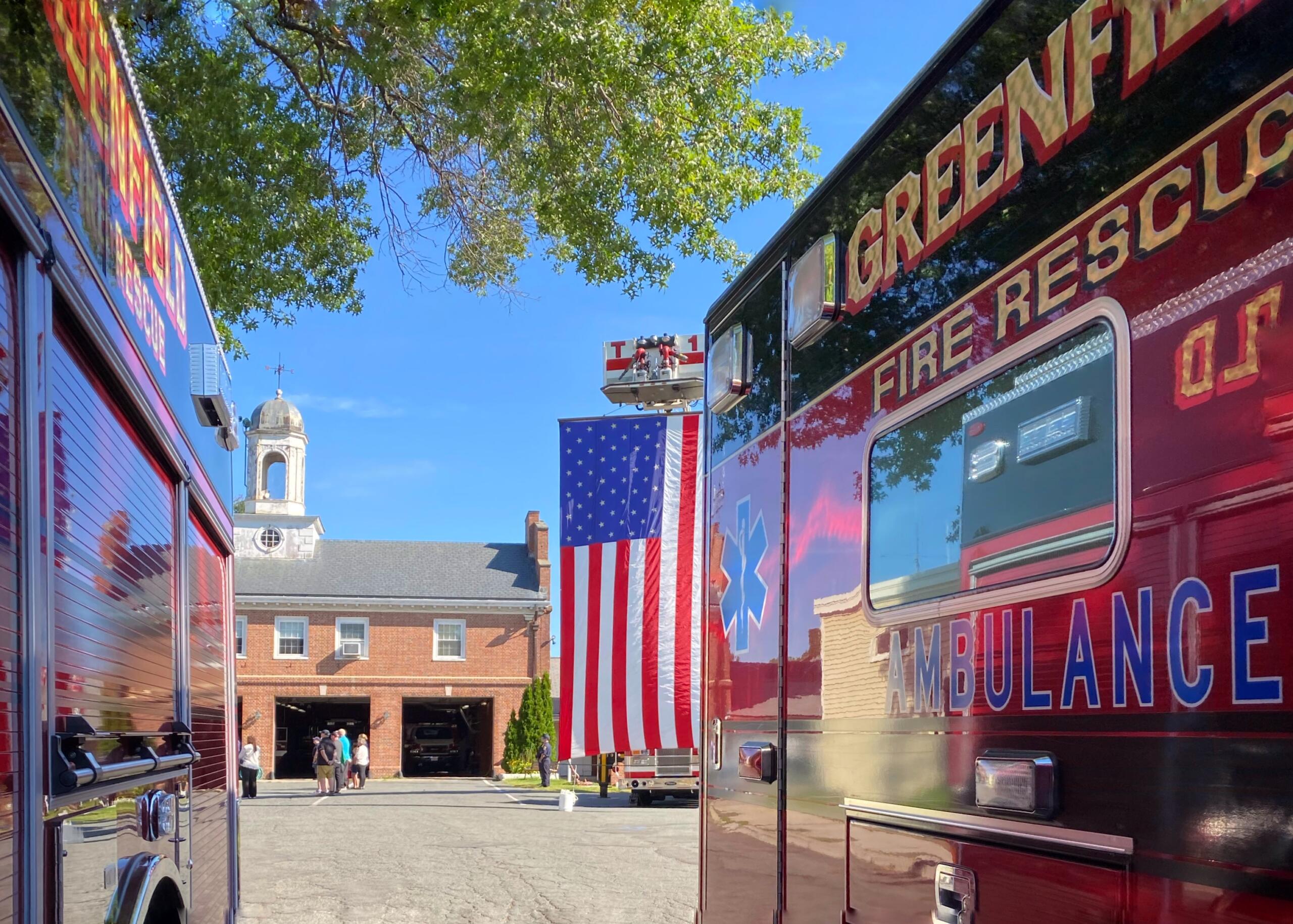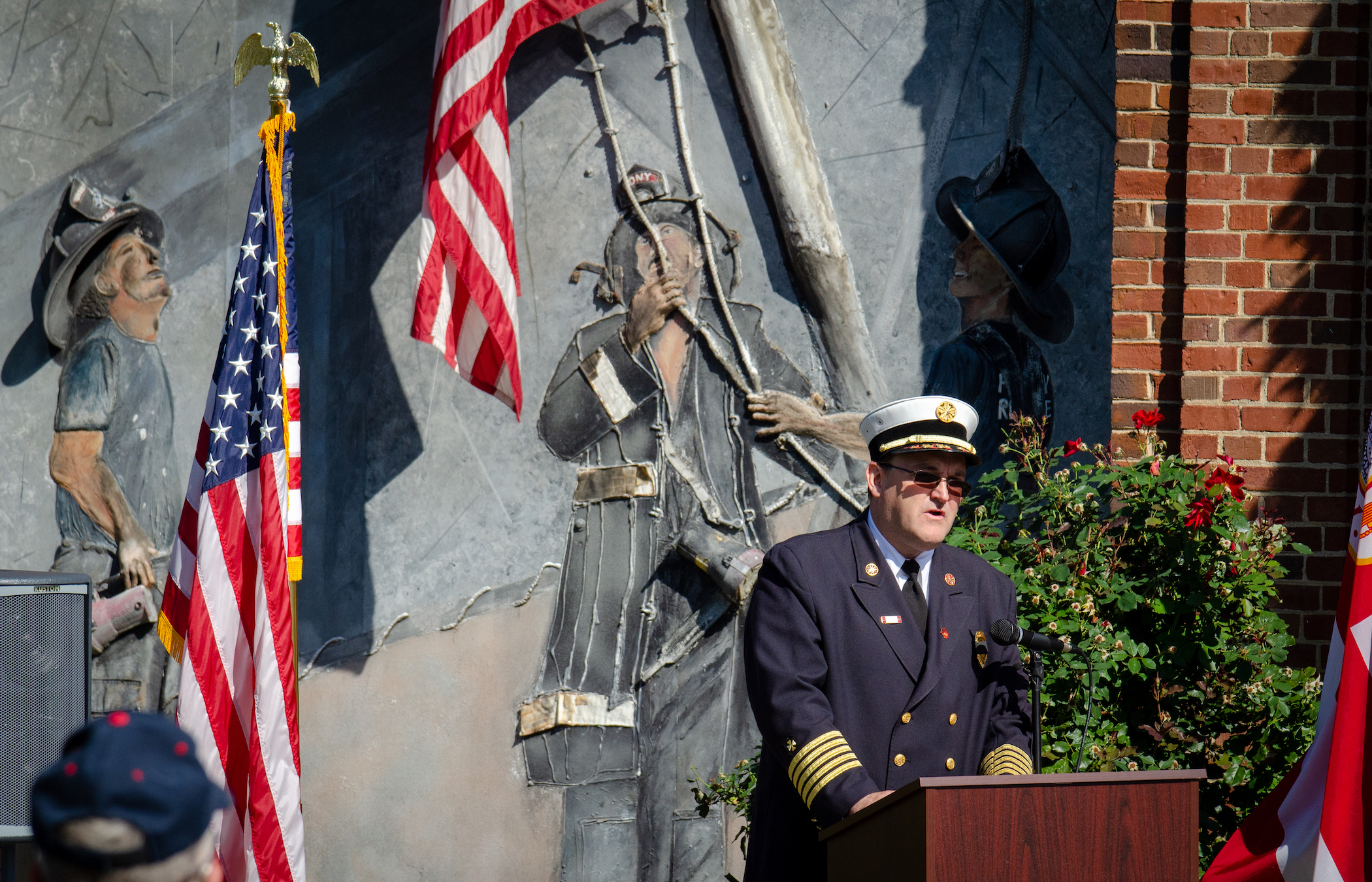 (Greenfield, MA) At 10am on September 11, 2021 members of the Greenfield community as well as Greenfield fire fighters and Greenfield police gathered to remember the events of September 11, 2001. The event included speakers from the Greenfield community as well as individuals who were working and living in New York City at the time of the attacks.