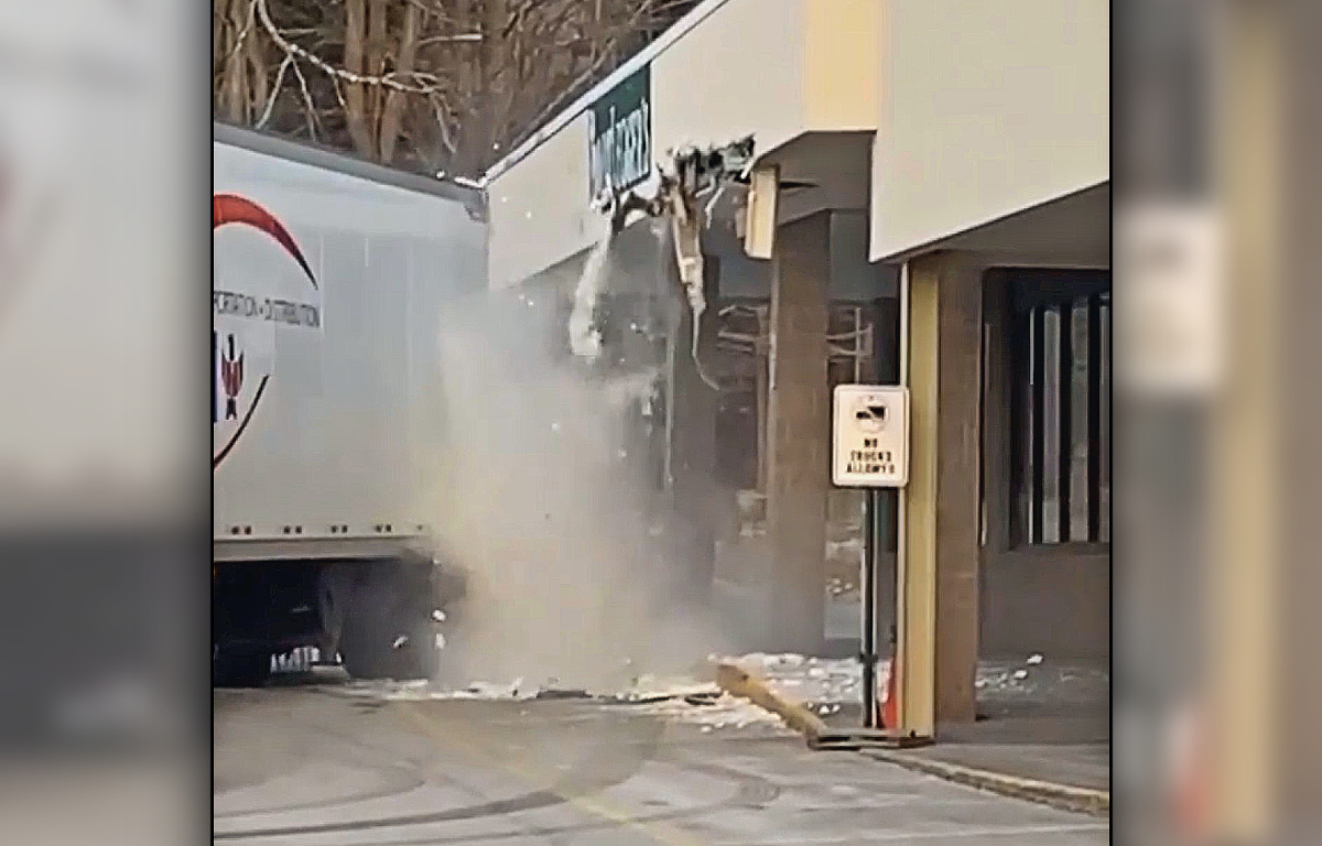 (Greenfield, MA) Early Tuesday morning a tractor trailer truck making a delivery struck the outside awning of Bootlegger’s shoe store in Greenfield. The truck was turning in front of the store when a portion of the truck’s trailer scraped across the awning.