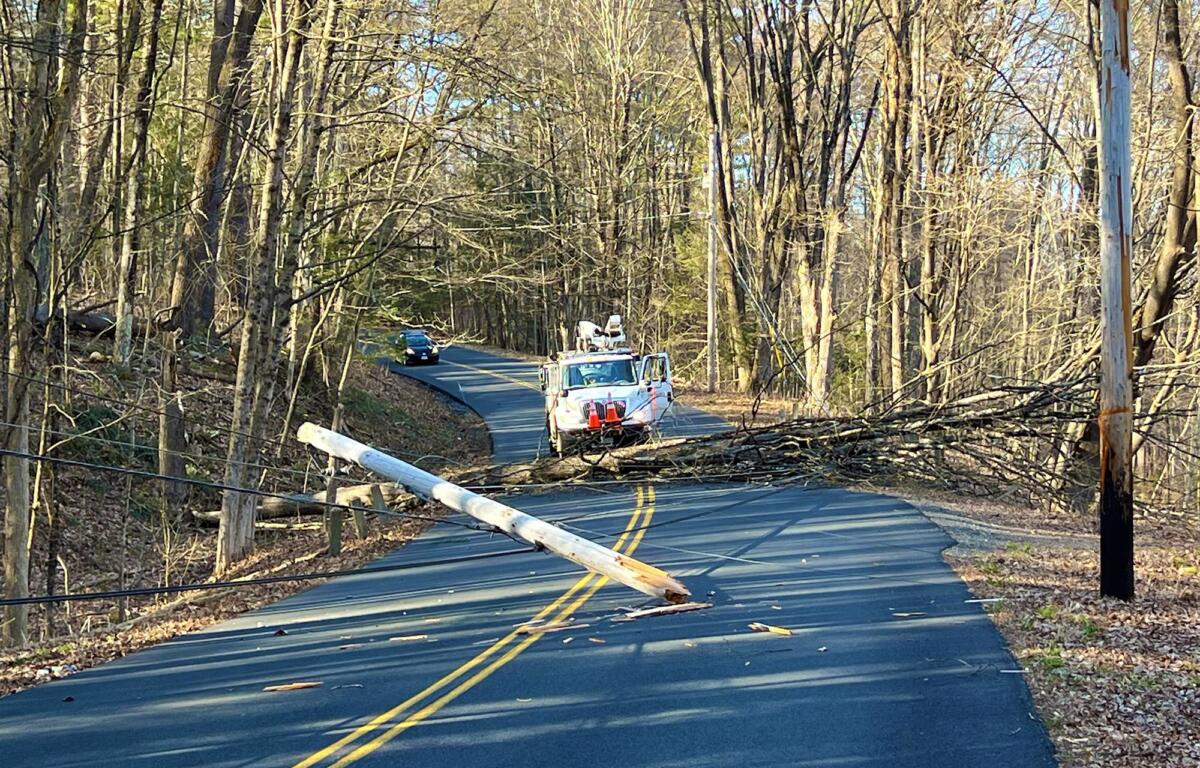 DEERFIELD, MA (FRANKLIN COUNTY NOW) — River Road in Deerfield was closed due to a tree and utility pole down across the road Monday afternoon during the high wind event. Eversource responded quickly to make repairs necessary to reopen the road. Leverett Fire Department responded to downed wires caught on fire on Richardson Road at the intersection with North Leveret Road. The live power line melted portions of the pavement, roads were closed until Eversource could de-energize the line.