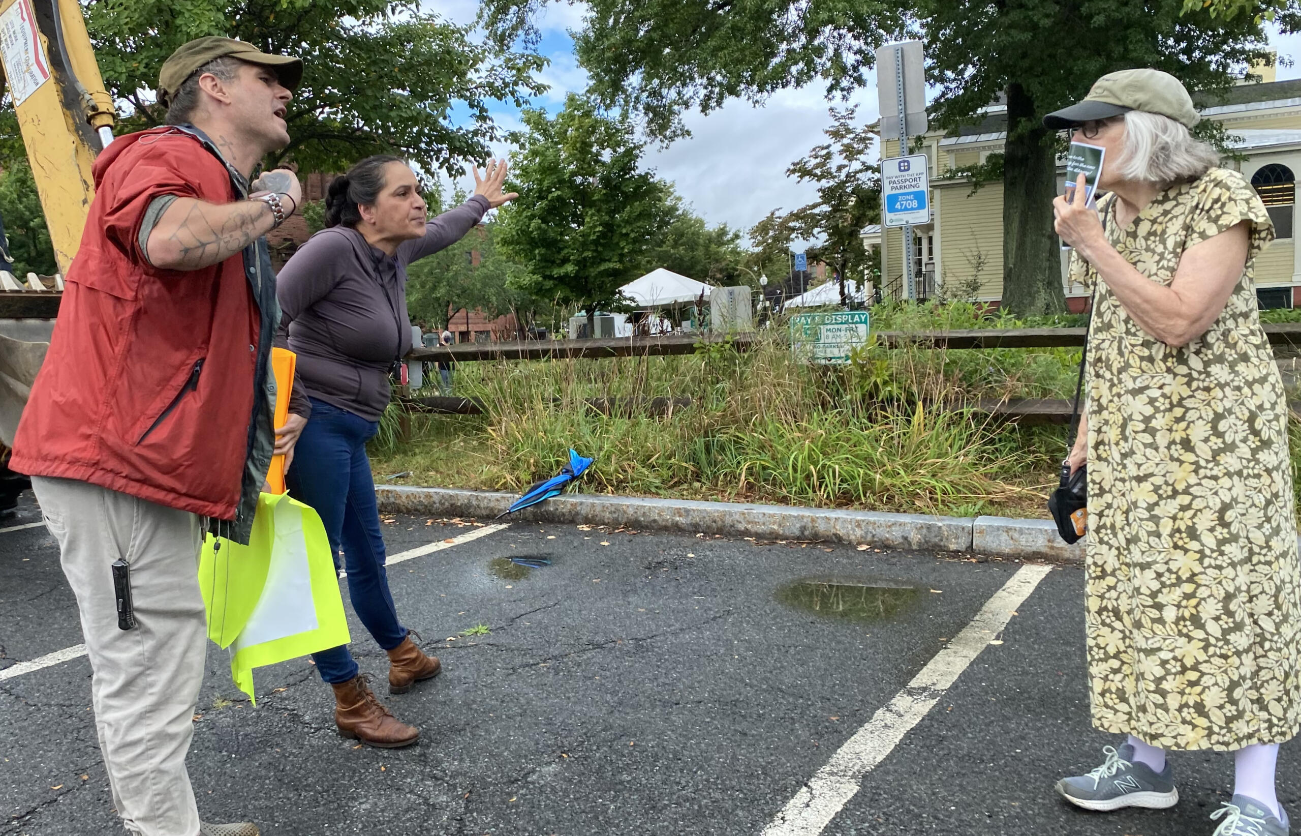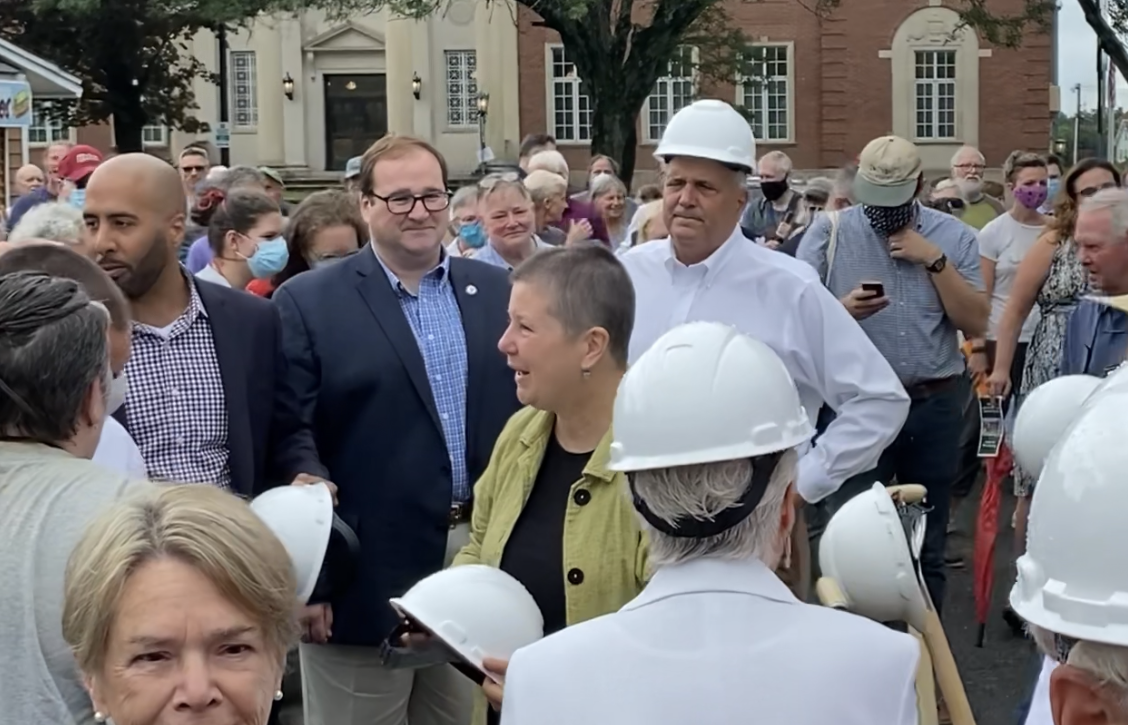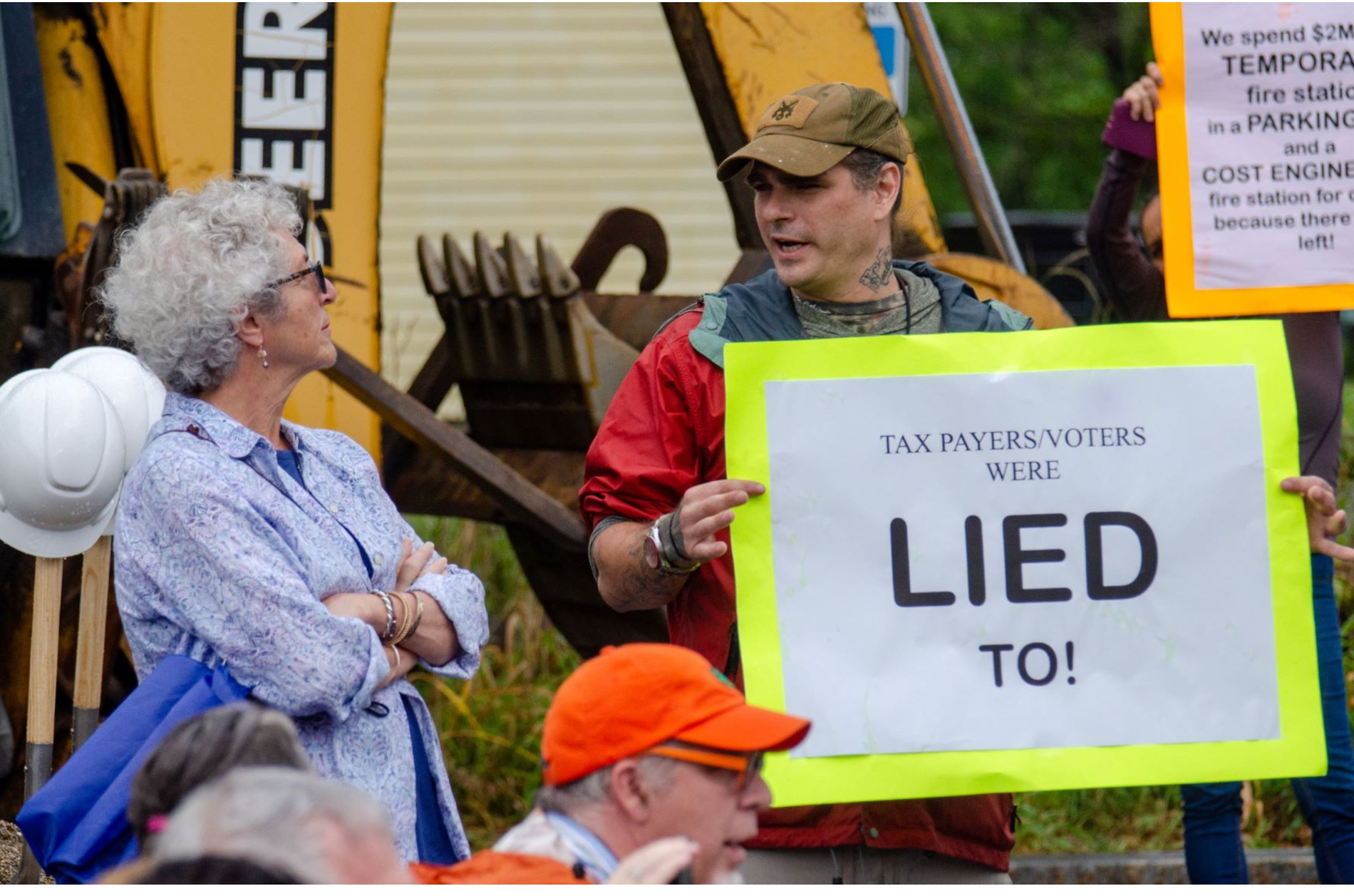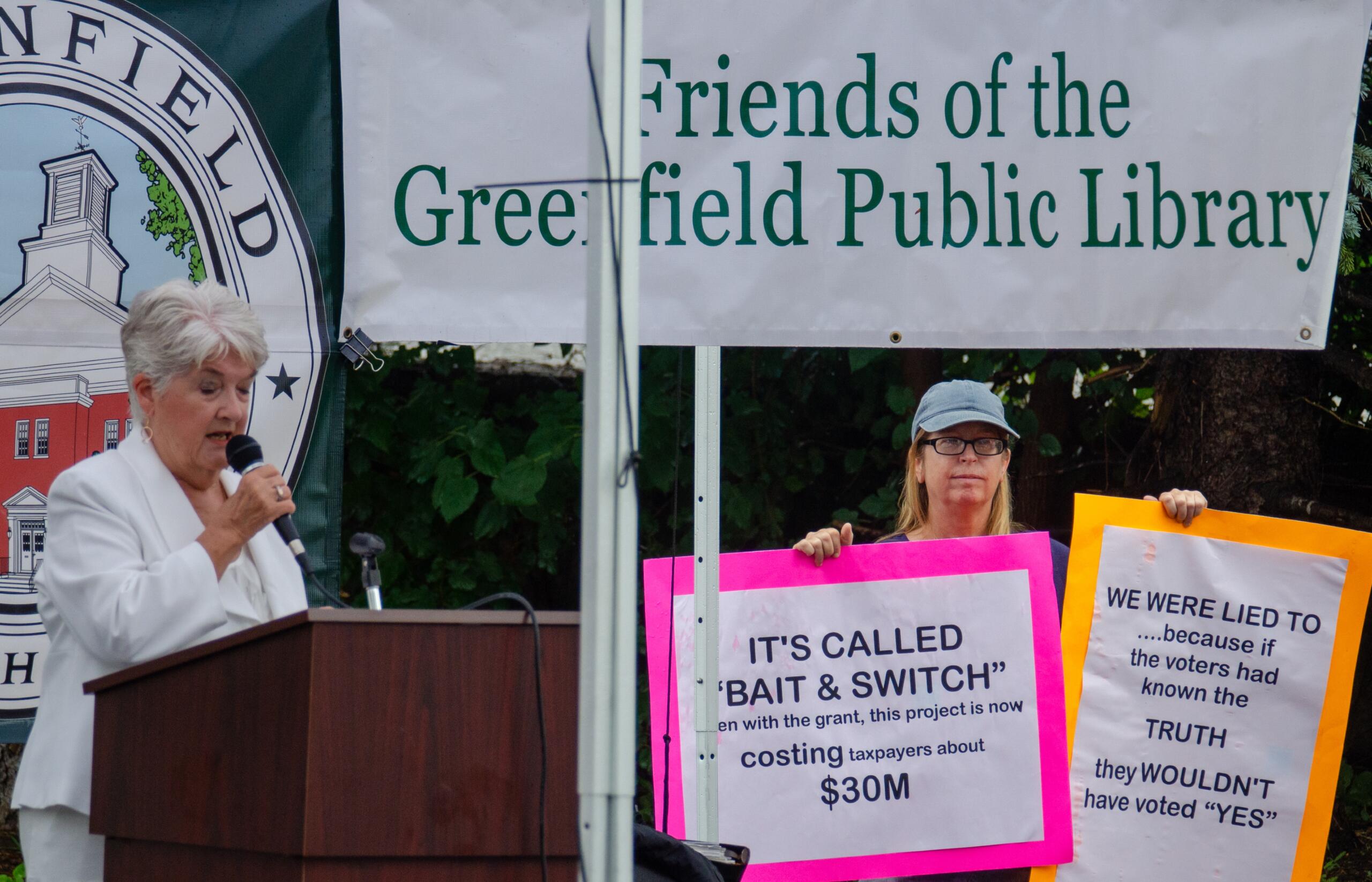 (Greenfield, MA) The groundbreaking ceremony for the new library in Greenfield drew many supporters on Thursday morning as well as protestors, who disrupted the event by interrupting speeches and the groundbreaking photo-op ceremony. Protestors, some standing and carrying signs and others seated, clashed with officials and members of the public at different times during the event. Several protestors carried signs that claimed Greenfield tax payers were lied to about the library’s cost while at least one sign opposed the relocation of Greenfield’s fire station.