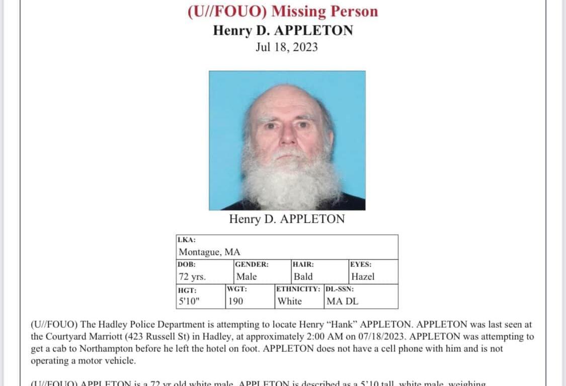 (Hadley, MA) Update: The missing 72 year old Montague man has been located. Wednesday afternoon the Hadley Police Department announced they had found Henry “Hank” Appleton who had gone missing Tuesday morning, when he was last seen at the Courtyard Marriott on Russell Street in Hadley at approximately 2 a.m. The Hadley Police Department reported finding Appleton safely in Amherst.