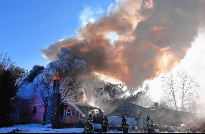 (Northfield, MA) A homeowner and his dog escaped a house fire at 386 Mount Station Road in Northfield on Friday. The two-story home was declared a complete loss by the Northfield Fire Chief Skip Dunnell 3rd. Mutual aid was provided by 12 area communities as the blaze was battled throughout the afternoon. Water was brought from Sawyer Pond to portable tanks at the scene. According to the homeowner, the fire started in the basement, close to the wood furnace.
