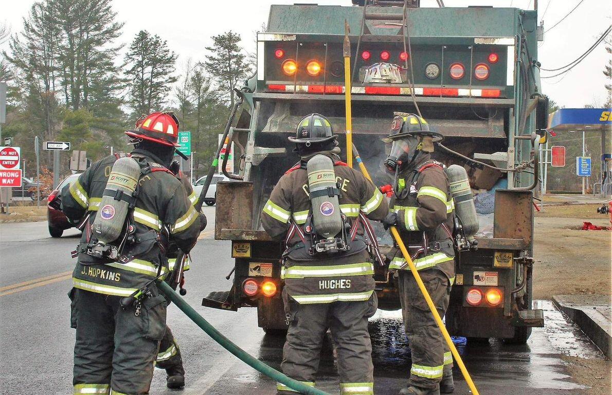 (Orange, MA) Orange Fire Chief James Young was driving on Danial Shays Highway Thursday afternoon when he saw smoke coming from the rear compactor of a trash hauler. He was able to alert the driver with his emergency lights and when the vehicle stopped, fire was visibly coming out of the hauler.