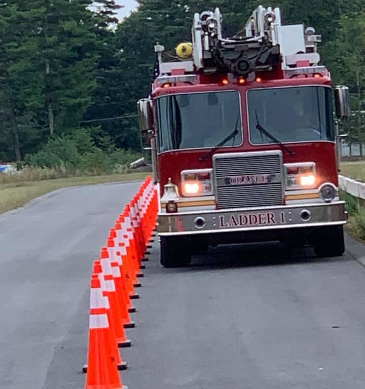 (Orange, MA) Orange Fire Rescue participated in some Emergency Vehicles Operations Course, or EVOC, training today. Engine 1, Engine 2, and Engine 3 as well as Ladder 1 and Tender 4 maneuvered through the challenging obstacle course meant to aid the department in keeping proficient with the massive 33,000 to 70,000 pound trucks. The course included backing down a narrow 200 foot alley, a serpentine course both forward and reverse, as well as a narrowing section with an offset at the end to simulate a quick emergency lane change, and a three point turn in a restricted area.