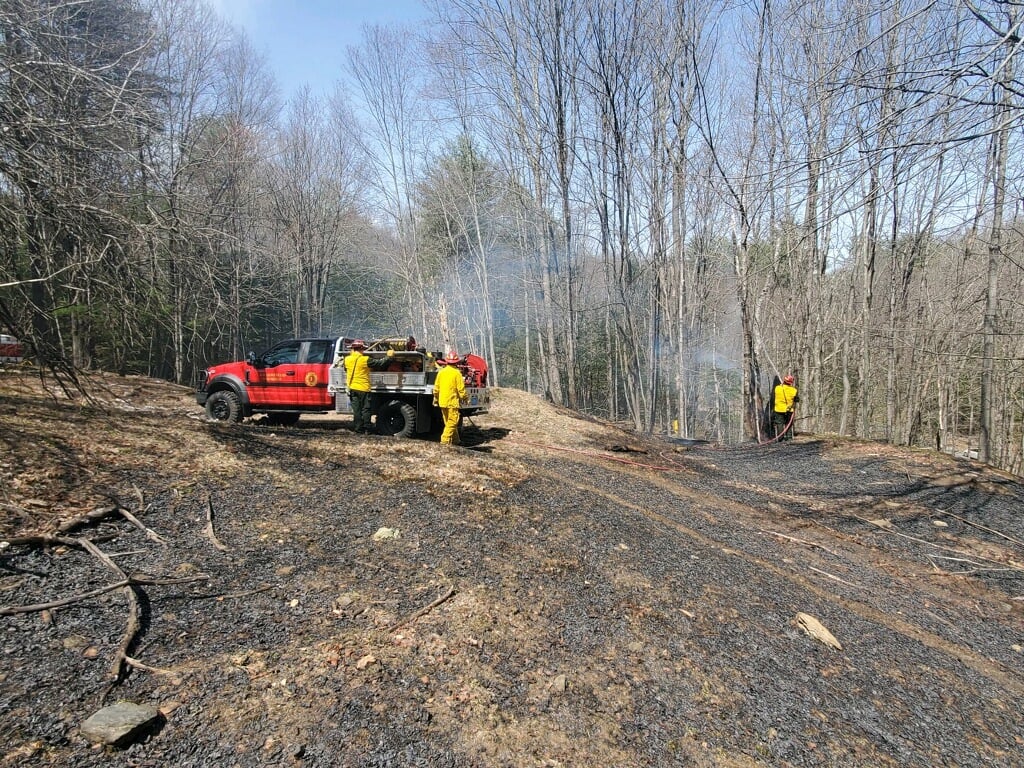 (Shelburne, MA) Wednesday afternoon a permitted brush fire on Taylor Road in Shelburne went on the move and Greenfield, Colrain, and Shelburne Fire Departments were called in to control the spreading fire. The wind had picked up and spread the fast-moving brush fire to about one and a half acres before the brush units could control it.