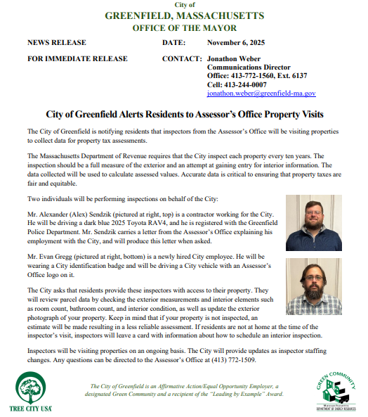 GREENFIELD, MA (FRANKLIN COUNTY NOW) — Some Greenfield residents may notice inspectors visiting their properties for property tax assessment data. The Massachusetts Department of Revenue requires each property to be inspected every ten years and two individuals will be completing the inspections this fall for the Assessor’s Office.