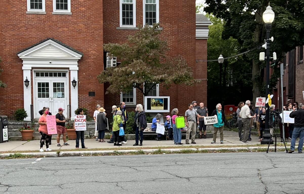 (Greenfield, MA) Update – Residents gathered in front of Greenfield City Hall Wednesday evening at 5 p.m. to speak out against racism and the Greenfield Police Department. There were chants of “No justice, no peace, no racist police.” Many brought signs with phrases like “End Racism In Greenfield,” “Remove Haigh,” “Not In Our Town,” “Racism Harms Everyone,” and “Justice For All, Not Just Some.”