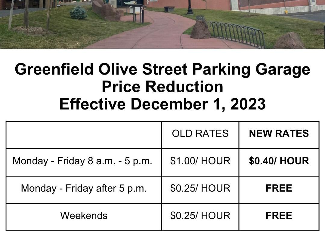 The city of Greenfield is excited to announce changes to the Olive Street Parking Garage resulting from the 2023 Downtown Greenfield Parking Study, effective as of Friday, December 1. The changes are as follows:• The cost to park in the Olive Street Garage will be reduced to $0.40/ hour. Payment will be required 8 a.m. to 5 p.m. Monday to Friday. Parking will now be free at all other times in the garage. Previously, the cost to park in the garage was $1.00/ hour during the day, $0.25/ hour in the evening and $0.25/hour on weekends, 7 days a week. The first hour of parking will continue to be free.• The fourth floor of the garage (roof) will now be free to park during the spring, summer and fall. The fourth floor is closed December 1, 2023 – April 1, 2024 due to winter conditions.• Payment will continue to only be accepted via the Passport parking app. The Passport app can be used citywide to pay for parking on Main Street and in municipal parking lots. Passport can be downloaded at https://www.passportparking.com/. There will no longer be an access gate upon entering the garage.• Monthly parking permits will continue to be available for $35. Permits can be used during paid parking hours (Mon-Fri 8 a.m. to 5 p.m.) to park throughout the garage. No permits or payments are required after 5:00 p.m. Permit information is available at greenfield-ma.gov.The 2023 Downtown Greenfield Parking Study found that the Olive Street Parking Garage is underutilized. The garage never reached more than 50% capacity during the study period. The study recommended reducing the cost to park in the garage as well as aligning paid parking hours with the rest of Greenfield’s downtown parking supply.The goal of these changes is to increase the utilization of the garage and thereby reduce demand on highly utilized parking spaces on Main Street. The new hourly rate of $0.40 is now lower than the $0.50/ hour it costs to park on Main Street.