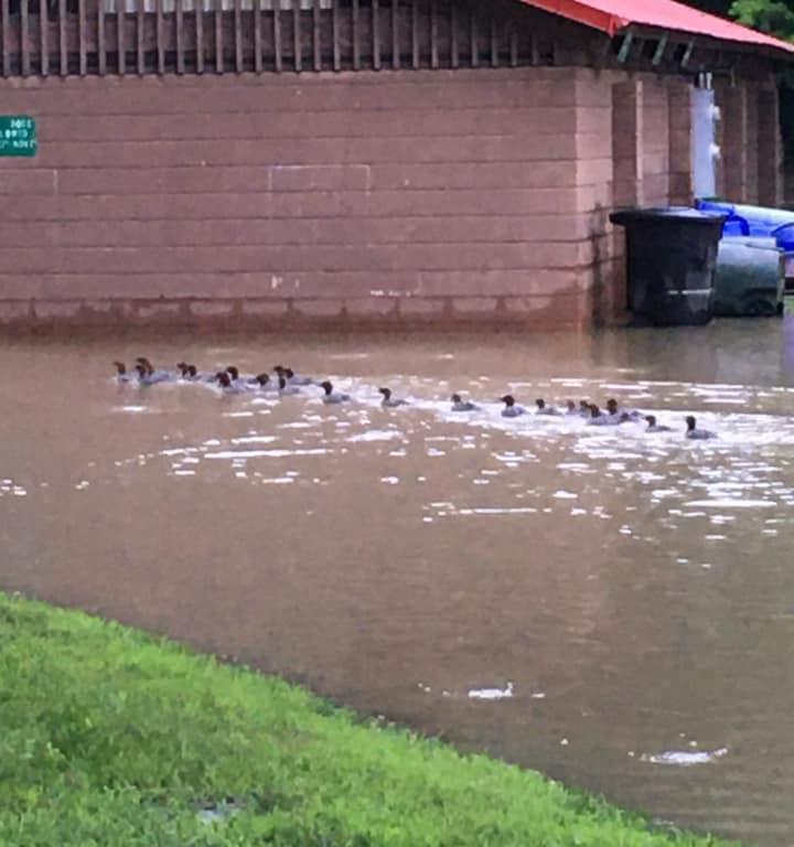 A duck floats in a flooded section of lawn near Unity Park and the bike path in Turners Falls on Monday following heavy rains that caused flooding throughout Franklin County.