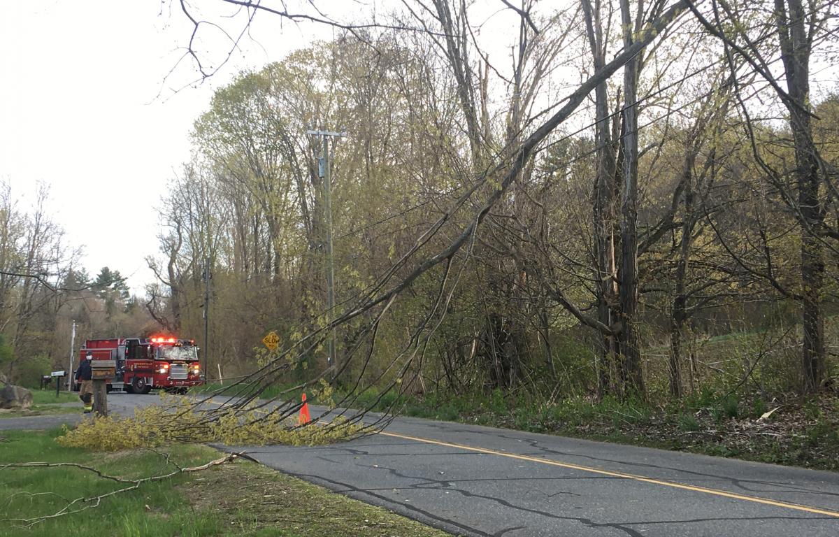 (Greenfield, MA) Saturday’s strange weather, including snow in early May and strong winds, also toppled some trees in Greenfield. This tree is down over Lampblack Road in Greenfield.