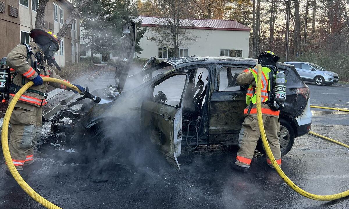 (South Deerfield, MA) Saturday evening, the South Deerfield Fire District responded to reports of a motor vehicle fire at the Red Roof Inn at 9 Greenfield Road in South Deerfield. When crews arrived on scene they found a fully involved vehicle fire and were able to quickly knock it down. Their quick work prevented the fire from reaching the Inn, however the vehicle was deemed a “complete loss” by the firefighters.