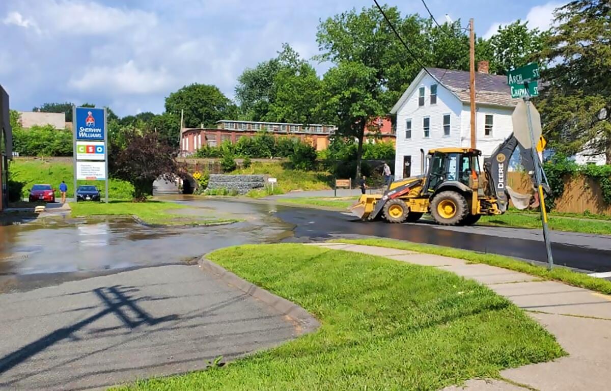 (Greenfield, MA) A large water main break on Arch Street has reduced water pressure in that area to liter or no water. The hydrant system is also impacted and additional tankers have been requested to cover Greenfield should the need arise. Greenfield Department of Public Works is currently working to repair the problem.