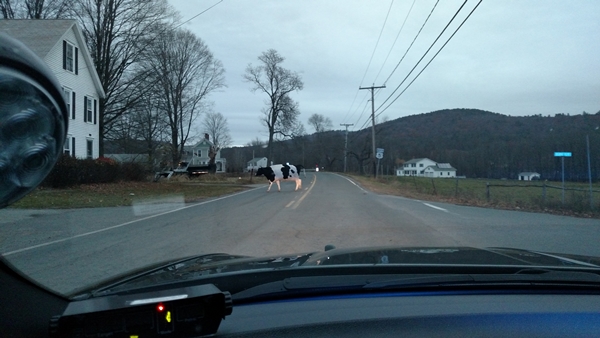 A cow crossing the road in Bernardston, MA.